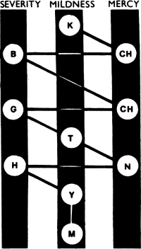 2. Chokmah (Sagesse). L’activité commence ; Kether devient dynamique en Chokmah, mais il ne s’agit encore que d’un dynamisme sans organisation, une pure poussée d’énergie cosmique. Chokmah est le Père Suprême, le Yod du Tétragramme, la force fécondante de l’univers. Son nom divin est Yavhé, son symbole est le phallus, et son image magique est celle d’un homme barbu.
